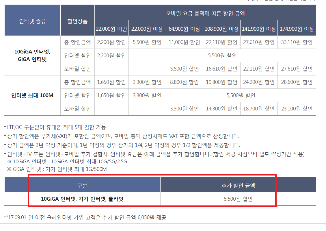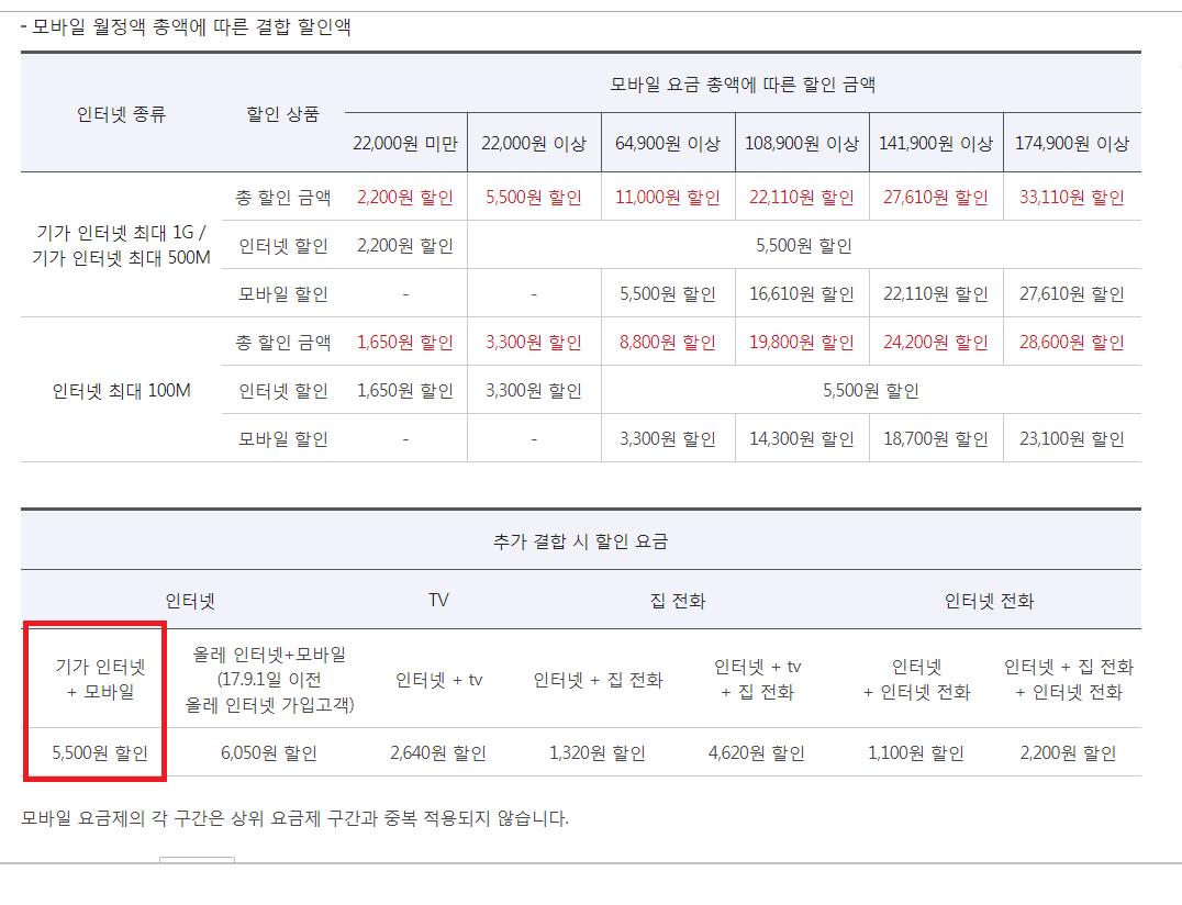 기가급 인터넷 + TV / 또는 모바일 결합시 : 인터넷에서 추가 5,500원 할인