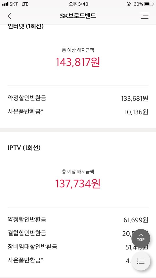 - 총 예상 해지금액 = 143,817(인터넷) + 137,734(IPTV)