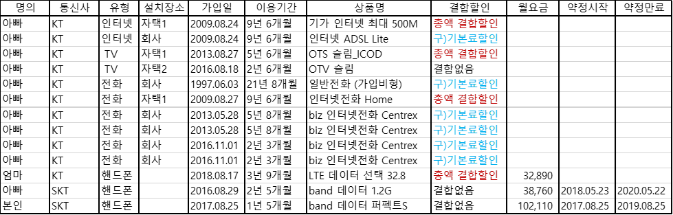 1. 신혼집 TV 인터넷 SKT로 신청, 본인과 아버지 모바일과 결합하여 결합할인을 받는다.