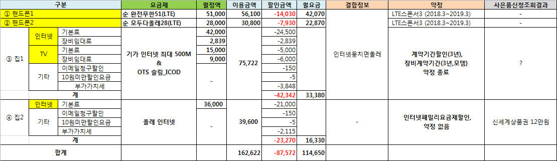KT로 핸드폰 2대, 집#1에 인터넷+TV를, 집#2에 인터넷 사용 중에 있는데