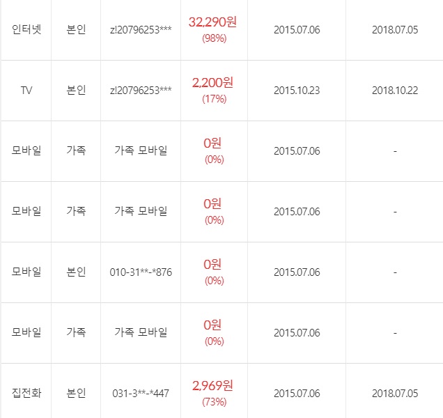그래서 남아있는(결합되어 있는) 핸드폰 요금제가 무엇인지에 따라 할인액이 달라집니다.