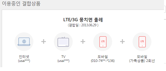 유군님께과 가족분들께서 적용되어 있는 결합상품은 LTE/3G 뭉치면 올레로