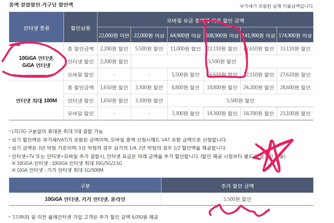 인터넷+TV 혹은 인터넷+모바일 결합시 얻어볼 수 있는 할인입니다.
