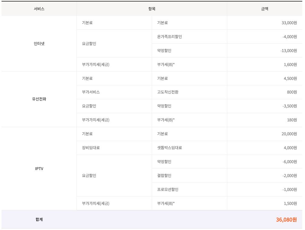 500메가 25,300원 + 스마트 플러스 (UHD) 16,500원 + 일반전화 1,100원
