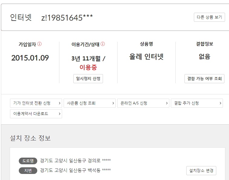따로 첨부해 주신 2015년부터 사용하신 인터넷은 본가에서 쓰셨던 인터넷이지요~?!