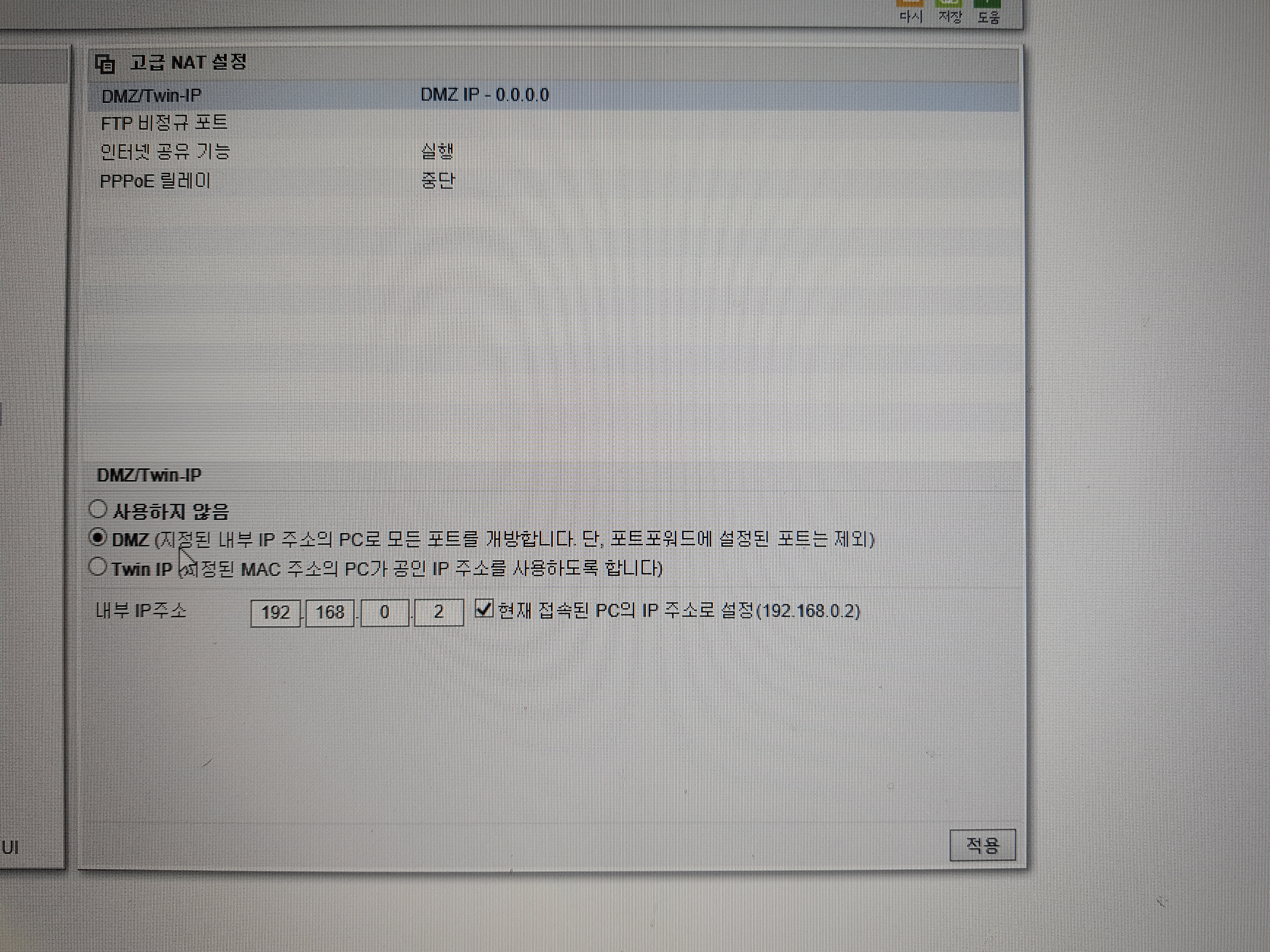 해당 PC(게임하는컴퓨터)의 내부아이피를 바이패스 시켜주면 되어요