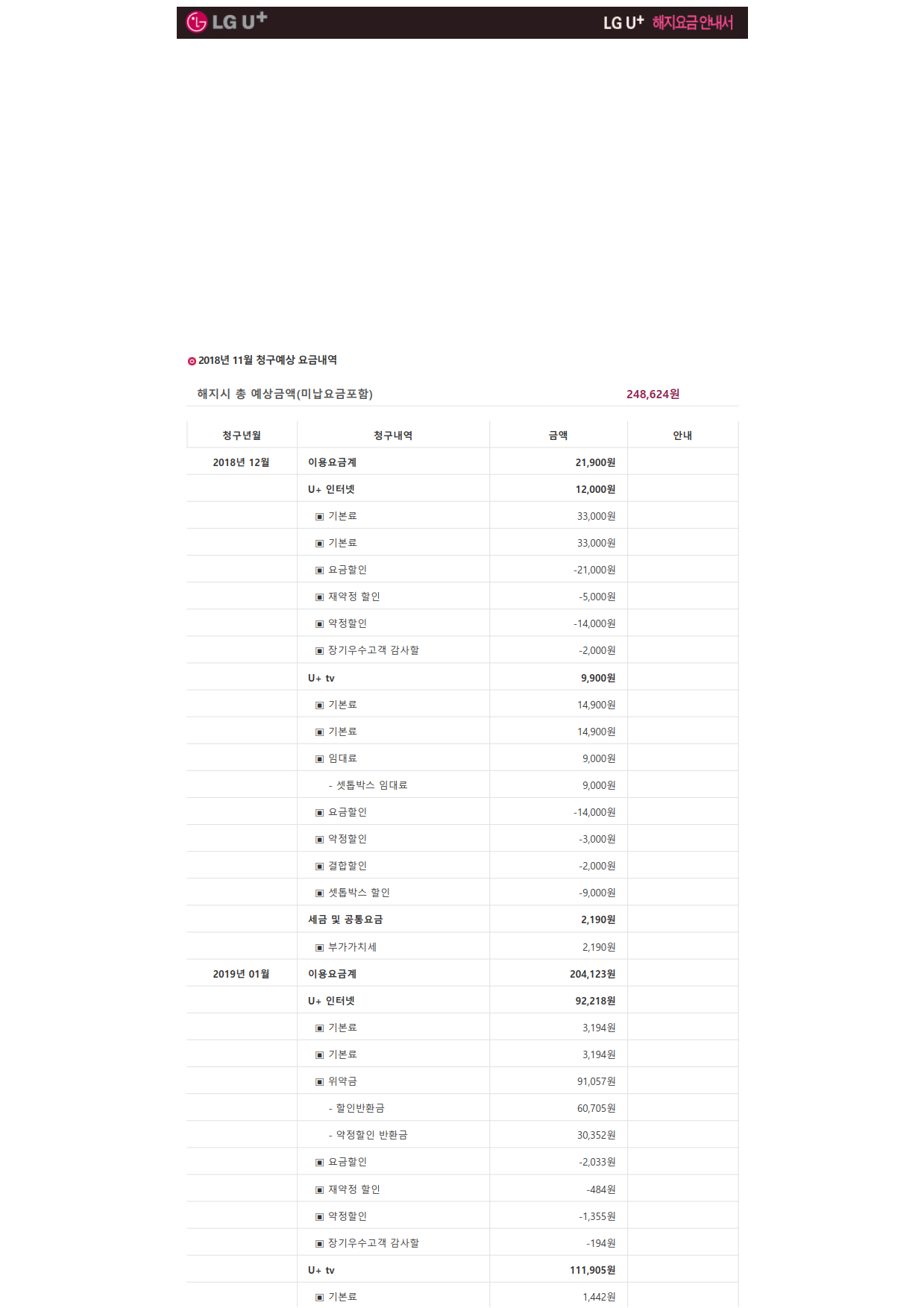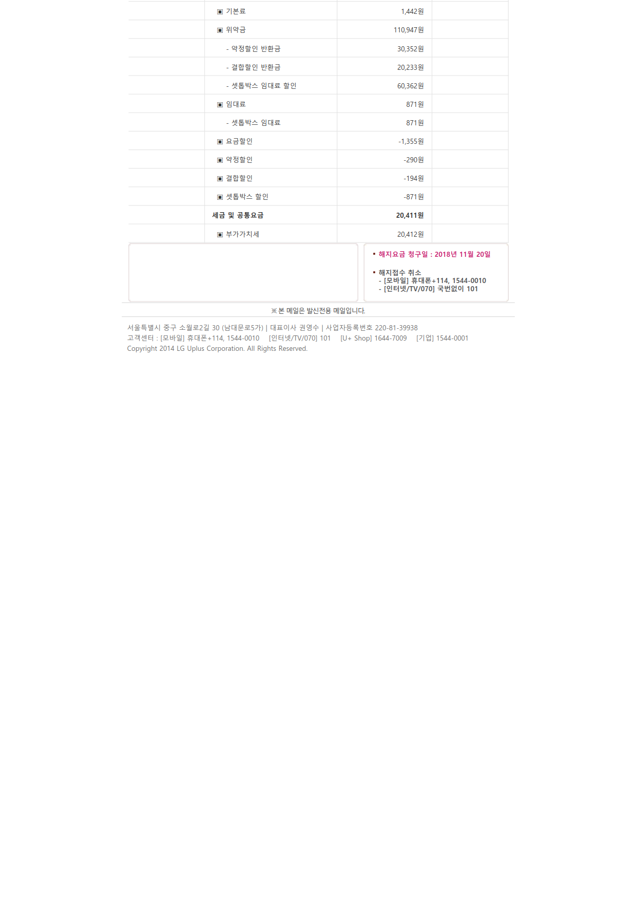 U+ 해지 요금 확인요청했는데 내역이 이와 같네요.