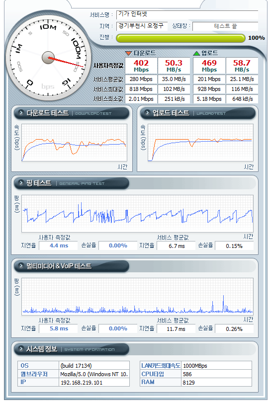 현재 LG 유플러스 인터넷 사용중이고 바꾼지 1년정도 됐습니다.(위는 방금 인터넷 측정 사진입니다)