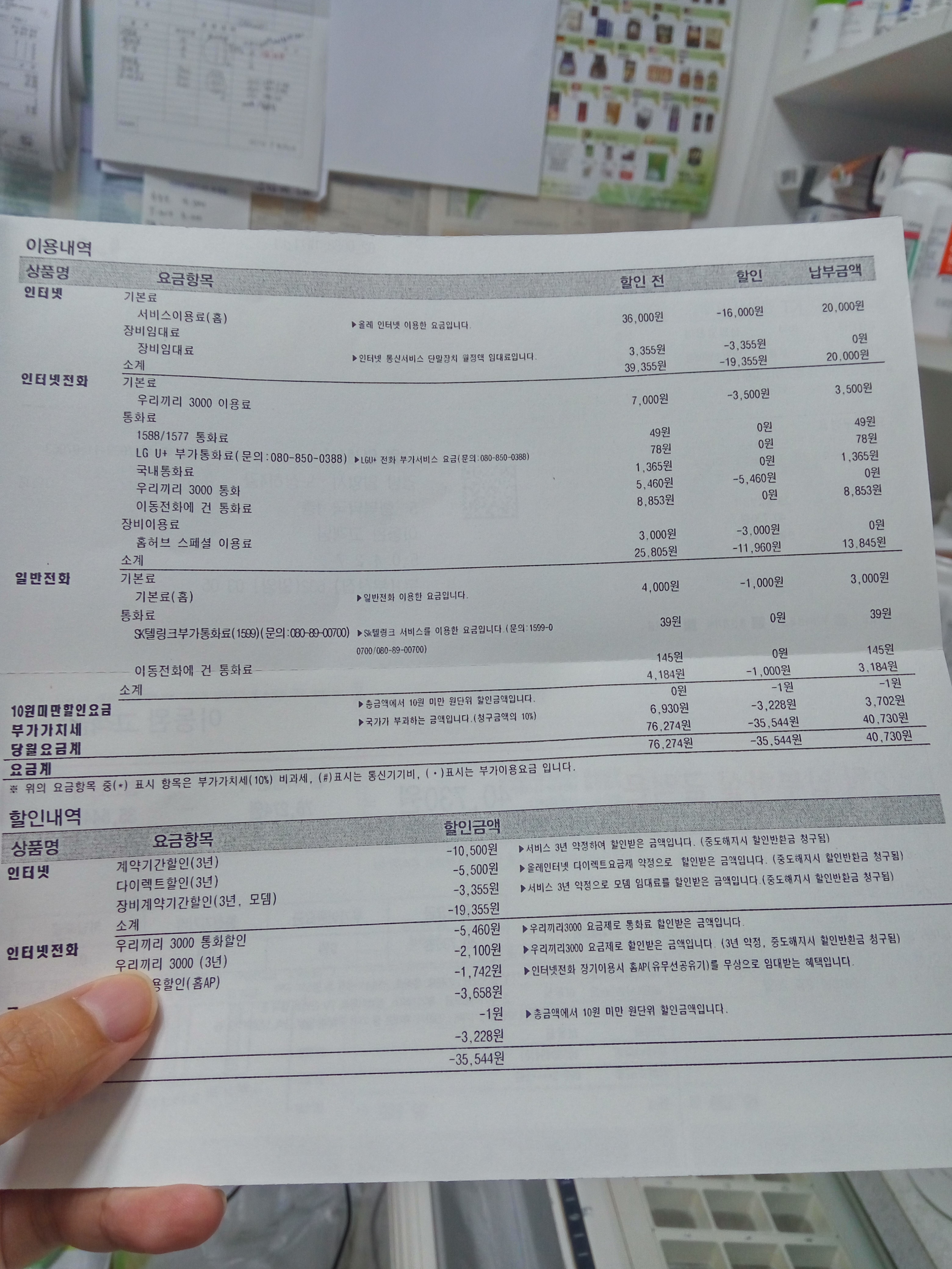 (현재 약국 KT 인터넷 + 인터넷전화 + 일반전화 = 총요금이 약 3만원..