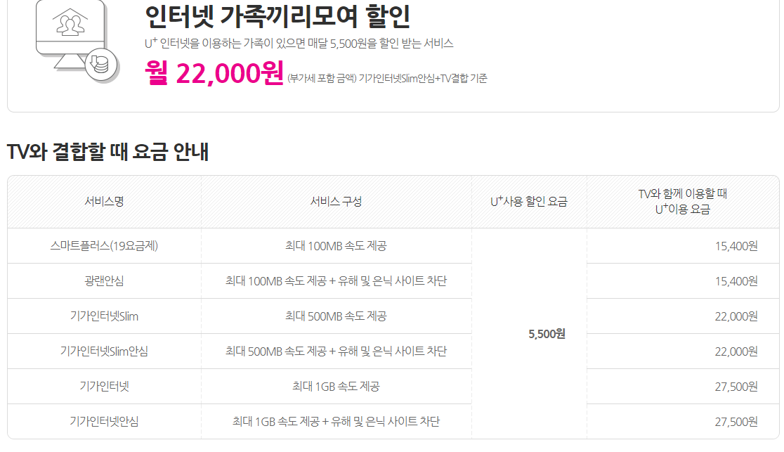 기가급 인터넷을 사용하면서 TV를 같이 신청하면 TV결합 할인이 적용돼(5,500원)