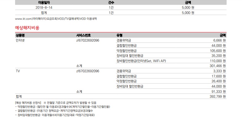 명세서에 기재된 예상해지비용이 어마어마하네요-_-; (KT 기준 9월으로 봤음..파일 별첨하겠습니다.)