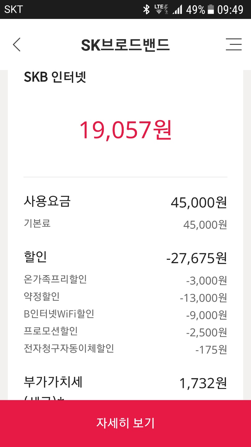인터넷 요금은 핸드폰을 결합해 온가족프리 할인이 적용되어 있고,