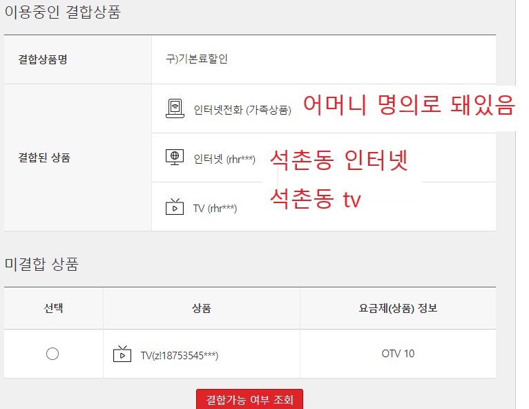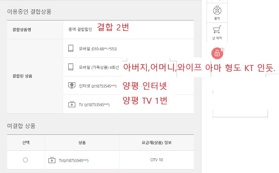 우선 제가 사용하고 있는 상품들을 kt 홈페이지에서 캡쳐를 해봤습니다.