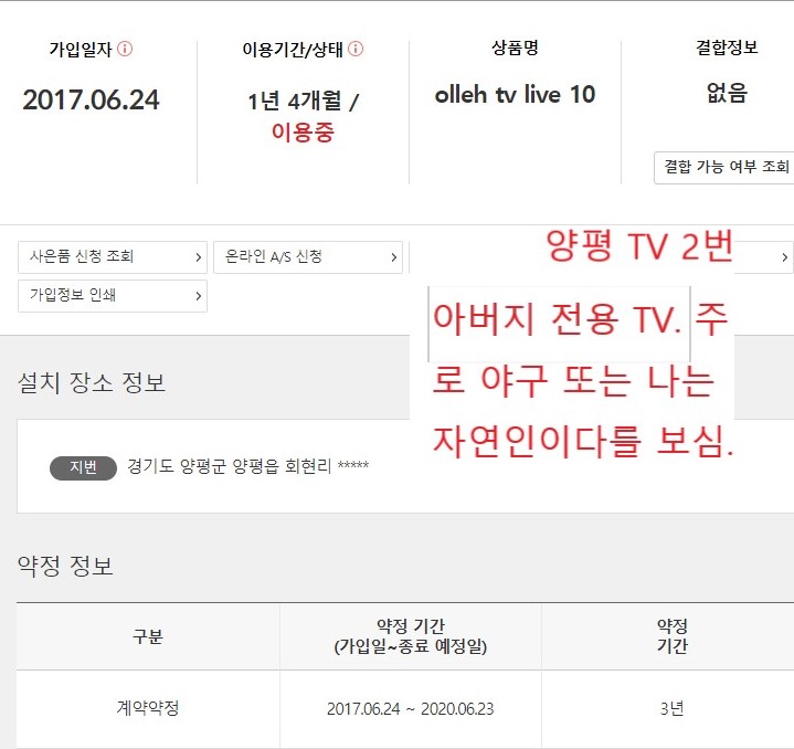 부모님은 양평에 계시고 tv 인터넷을 사용중이십니다.