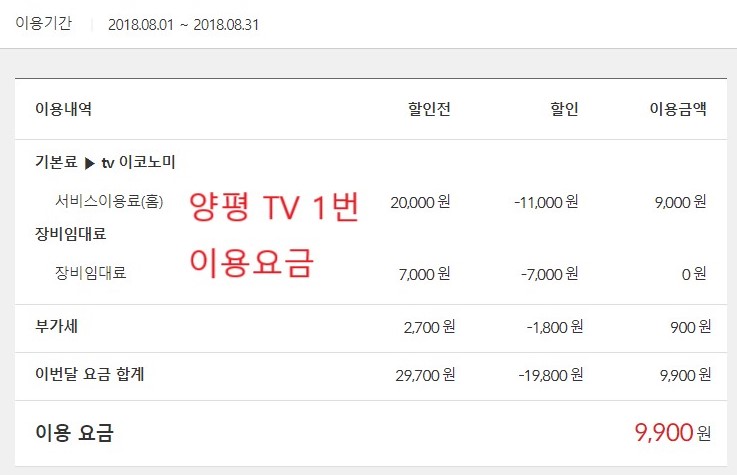 일곱번째로 양평 tv 1번 요금을 가져와봤습니다.