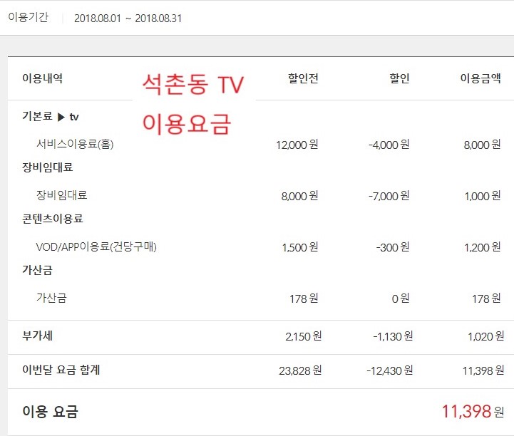 세번째로 석촌동 tv의 요금을 가져와봤습니다.