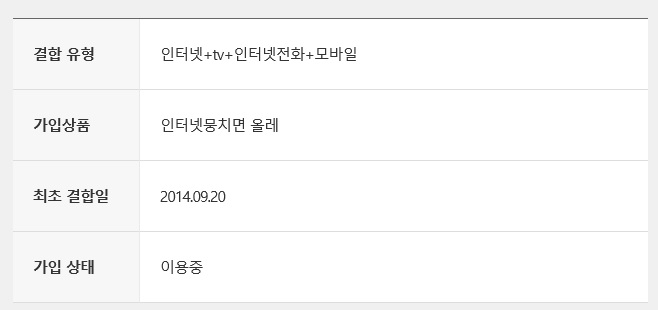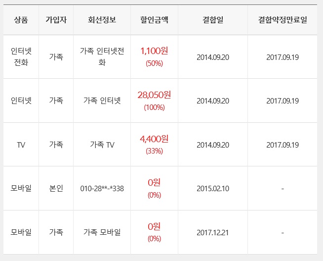 현재 KT 인터넷뭉치면올레(인터넷전화+인터넷+TV)+휴대폰2대 결합해서 사용하고 있습니다. 약정은 2017년 10월에 만료되었고, 재약정없이 계속 사용 중에 있습니다.