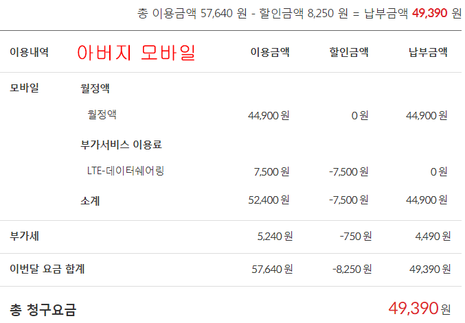 ② 아버님 핸드폰 요금에서 3,300원 할인