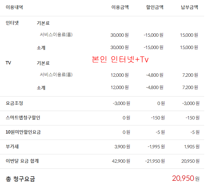 인터넷 요금에서 주어지는 할인혜택을 한쪽에만 받을 수 있어서