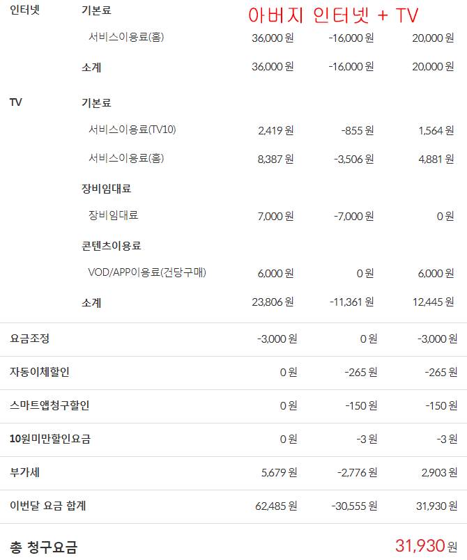 ① 아버님댁의 인터넷 요금에서 5,500원 할인
