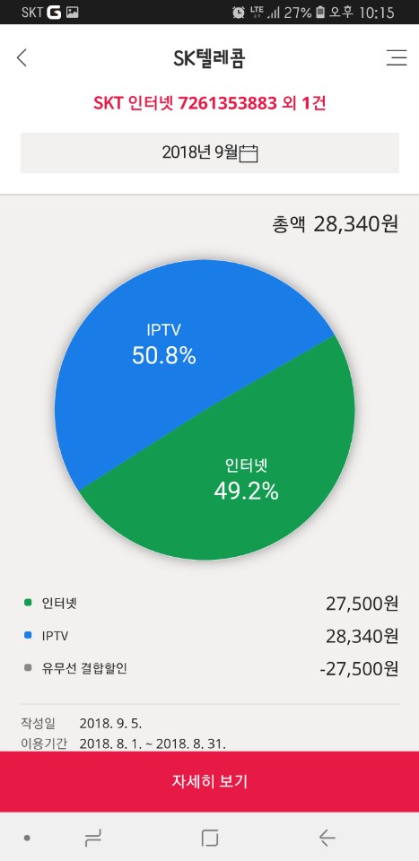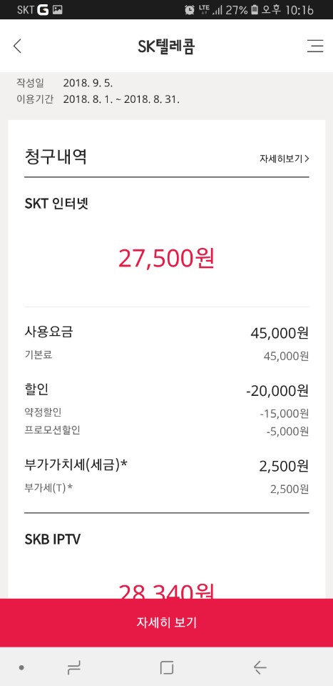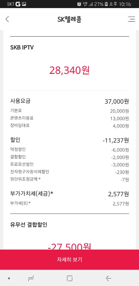 우선 지금 사용요금으로 캡쳐하여 문의드립니다. 그리고 콘테츠이용료 13000원은 재방송보는거 결재해놓은겁니다.