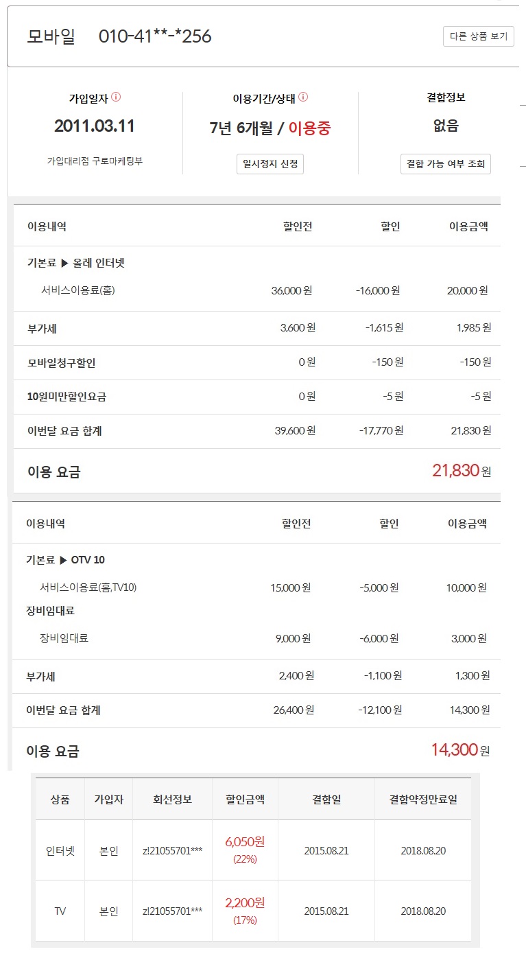 -결합한줄 알았는데 안했었나봐요ㅋㅋ 첨부파일 보면 아시겠지만 인터넷이랑 TV만 묶어놨었는데 이제 8월 20일부로 결합이 끝난거 같네요.
