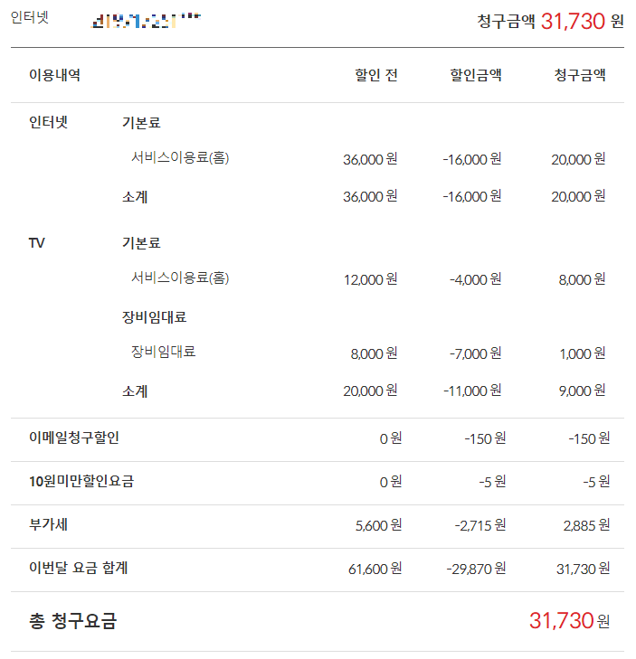 현재 다달이 나가는 요금은 다음과 같습니다.