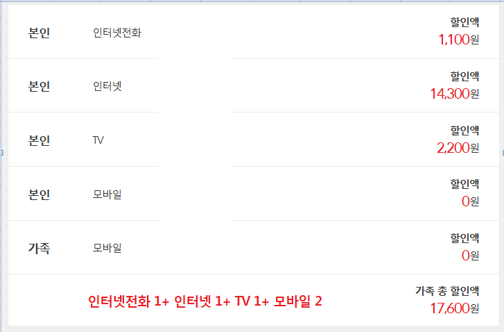 -> 인터넷 요금 5,500원 + 핸드폰 요금 22,110원 할인 (각자 7,370원 할인)