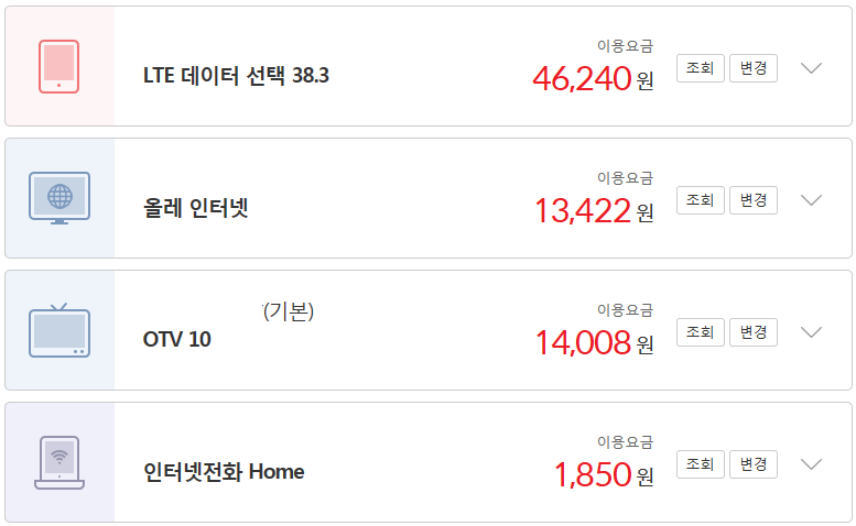 이용중인 서비스 및 할인액은 아래와 같습니다.