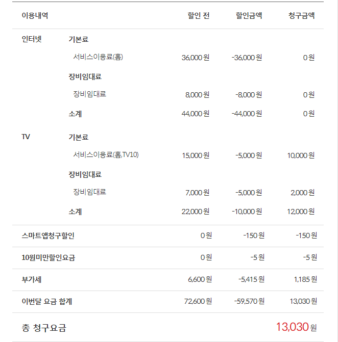 *총액결합할인 -> 인터넷과 핸드폰 요금을 함께 할인해 줌!