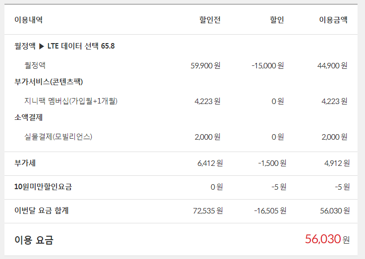 => 남아있는 핸드폰 1회선은(65.8요금제)