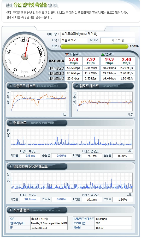다운로드 57 / 업로드 19 Mbps 정도가 나오는군요~!!!