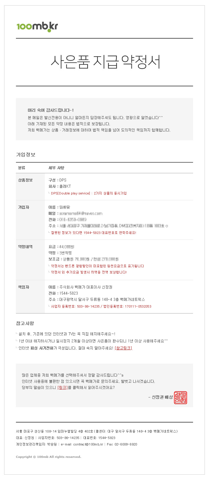 넵~ 백메가로 가입해주신다면 사은품 약정서를 보내드리고 있습니다!
