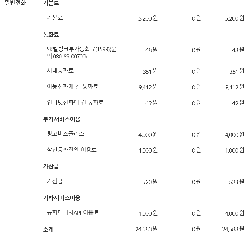 일반전화 요금 내역입니다. 일반전화는 약정 정보는 따로 없었습니다.