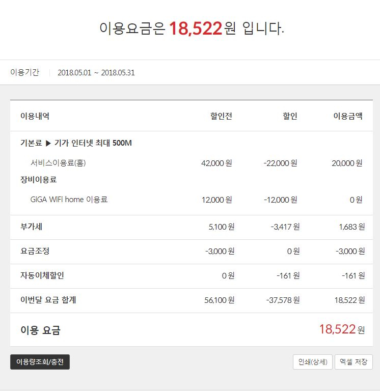 요금명세서보시면 아시다시피 500메가 기가인터넷 +기가와이파이를 월 18000원에 이용중에있습니당