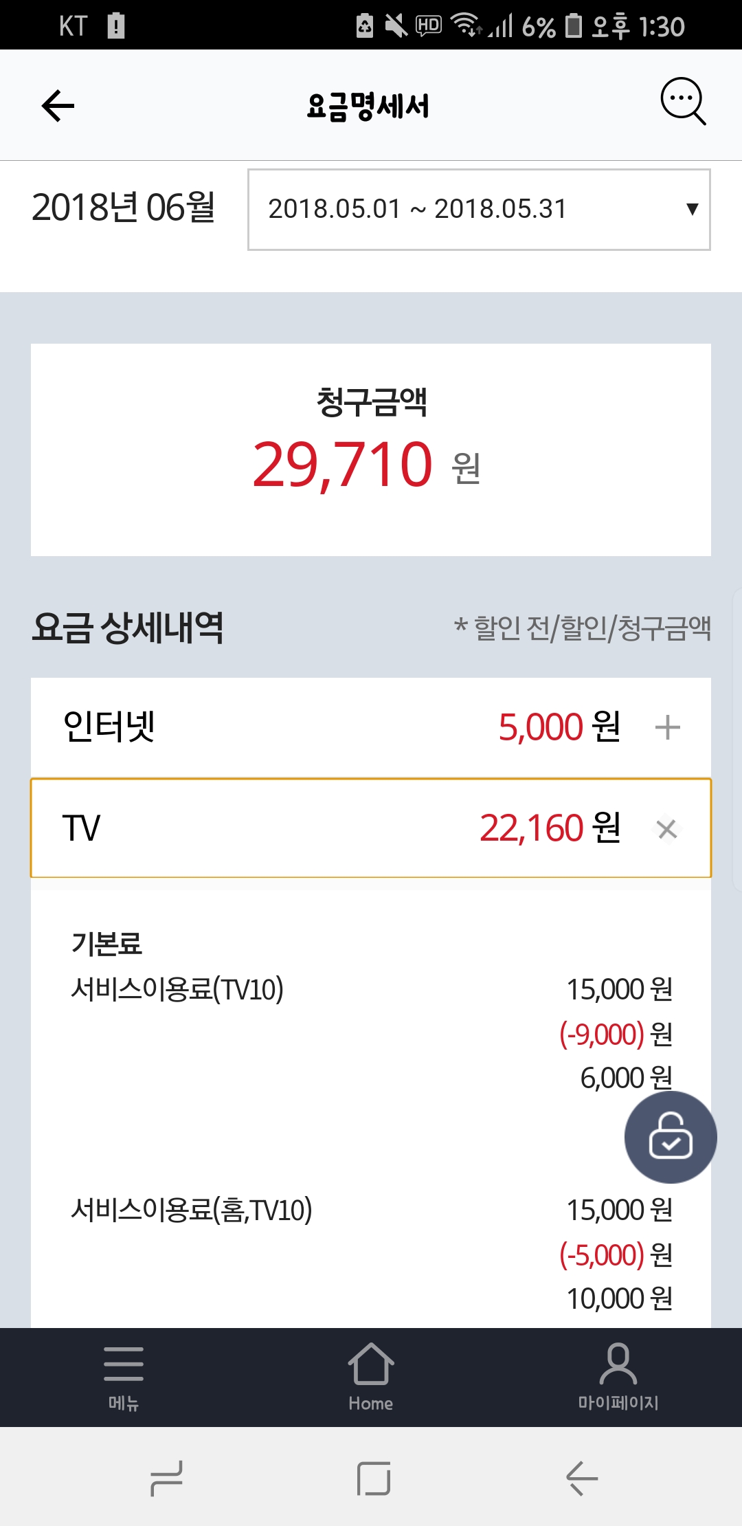 인터넷+TV 요금청구서를 캡쳐해서 남겨주시면