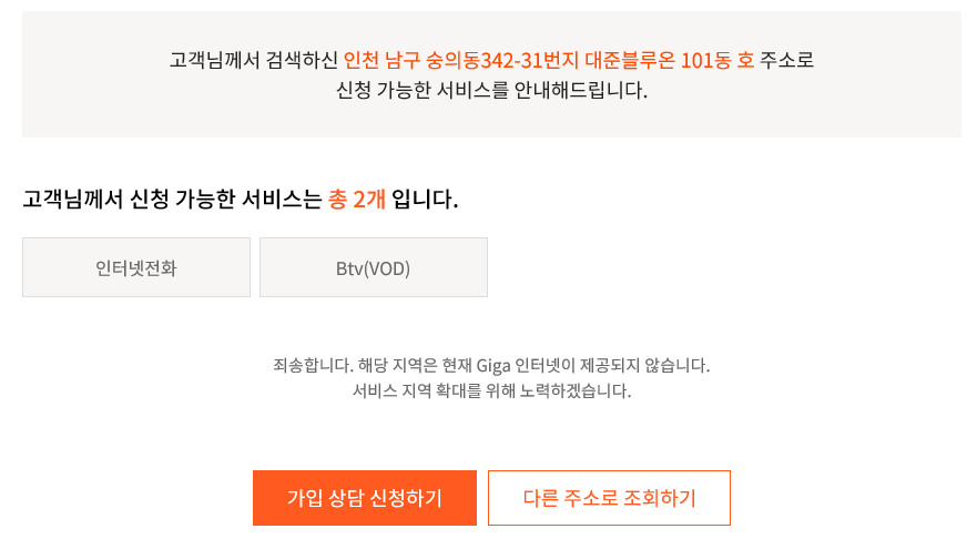 홈페이지를 통해 확인해보니 서비스 불가능한 지역이라고 하더라~