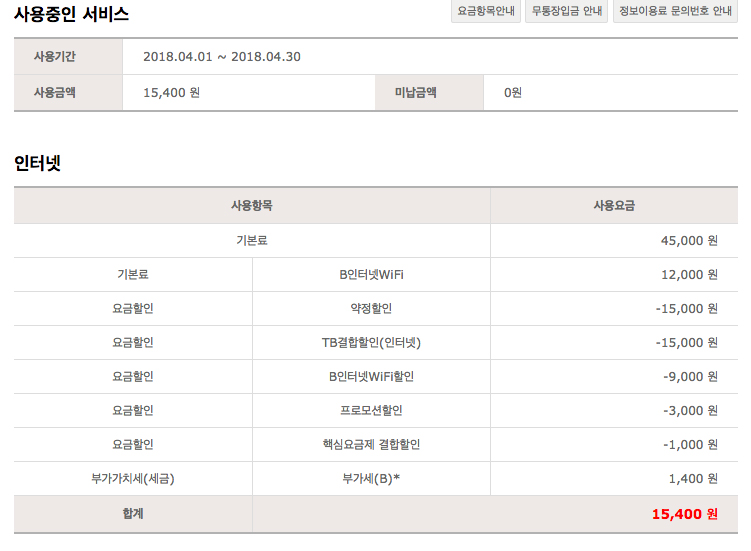 인터넷 : 11,000원, TV : 13,200원의 비용을 청구해가고 있는데