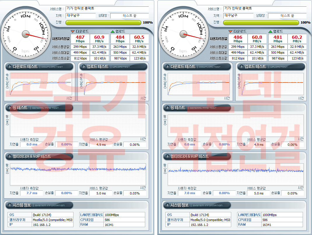 다운로드 속도는 497Mbps정도로 신청한 인터넷 속도에 맞게 나오는 것 같은데, 업로드 속도는 105Mbps정도로 1/4속도로 나오네요.