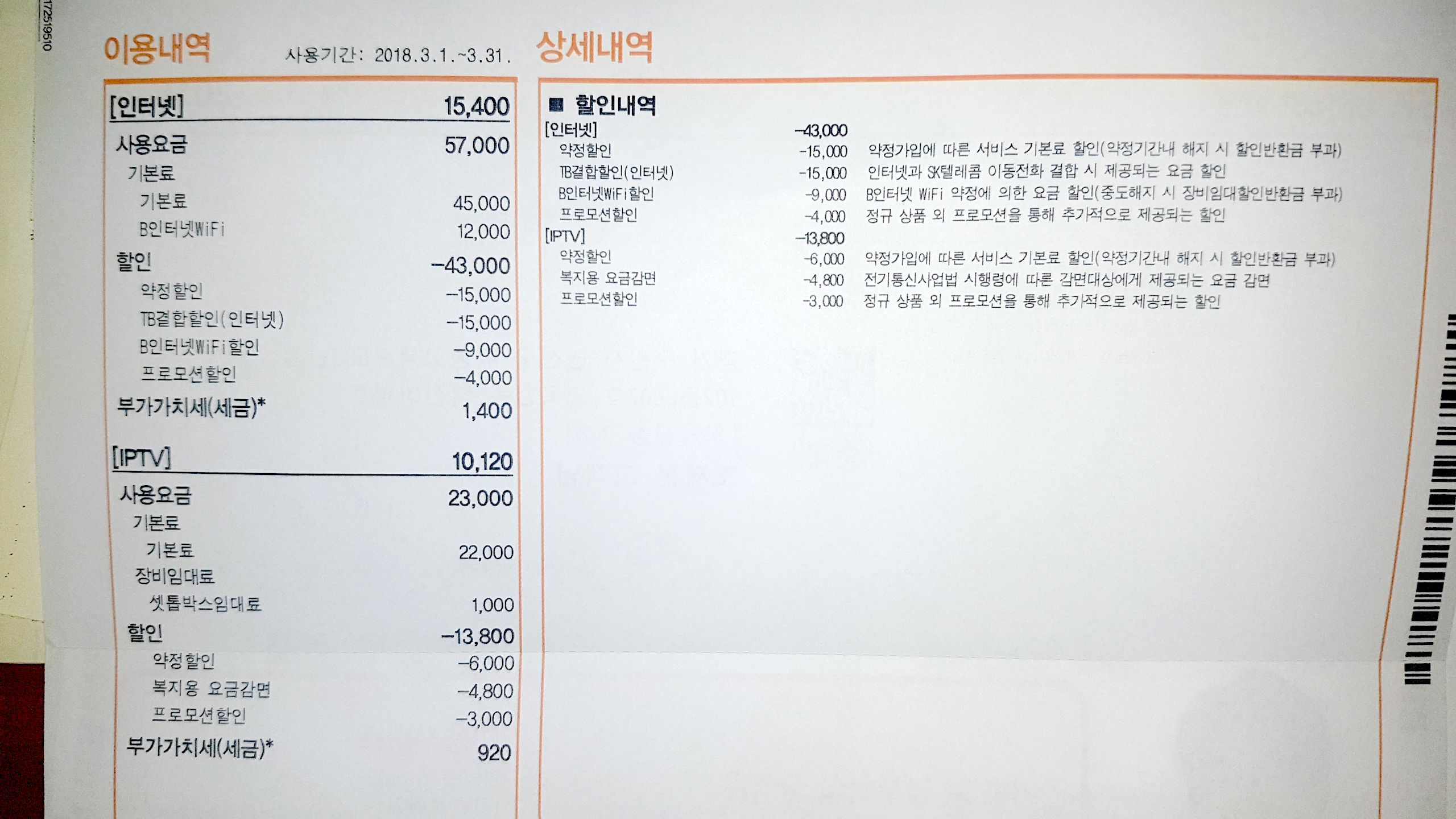 대표명의자분의 핸드폰 요금에서 1,100원 할인,