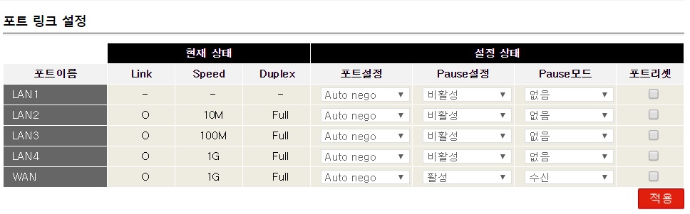 현재 서재PC가 1G로 연결되어 있는 LAN4이며, 거실 PC는 100M으로 연결되어있습니다.