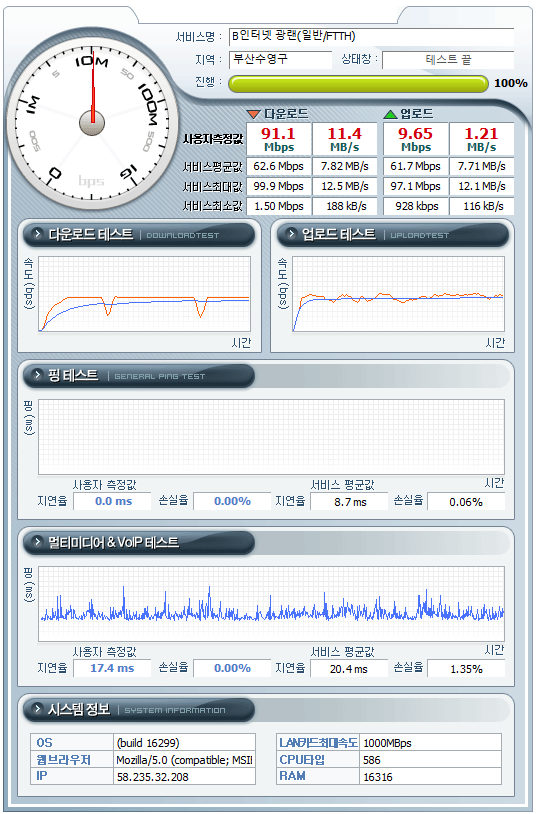 속도 측정결과 짱짱하고 빠른 속도라니 다행입니다.