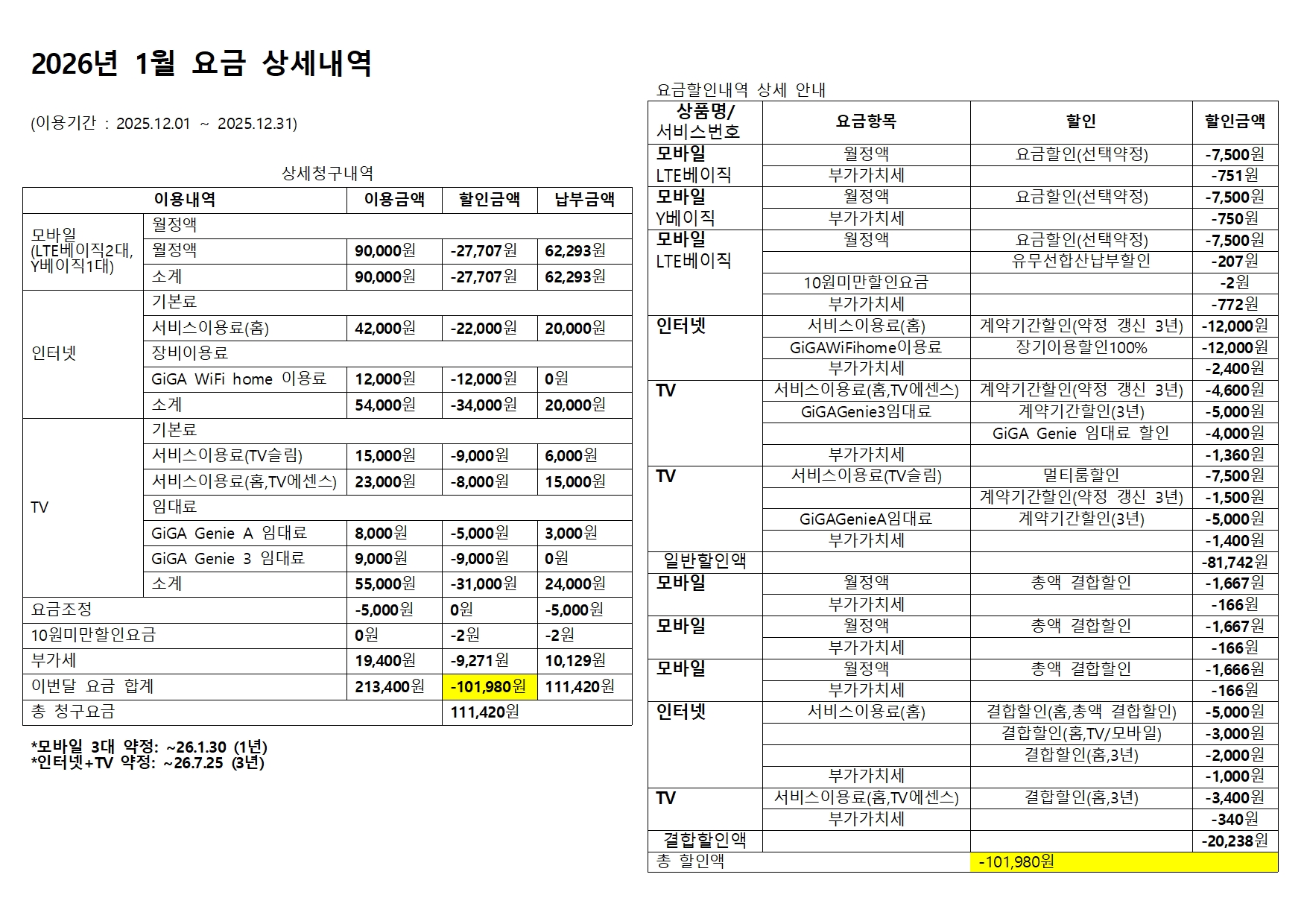 보시다시피 모바일 3대는 이번 달(26년 1월)에 약정 만료이고, 인터넷+TV는 7월에 약정 만료입니다.
