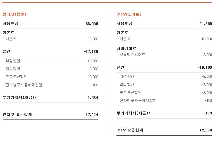 인터넷이 17,424원 + TV가 12,970원 = 총 30,394원 인데요~^^
