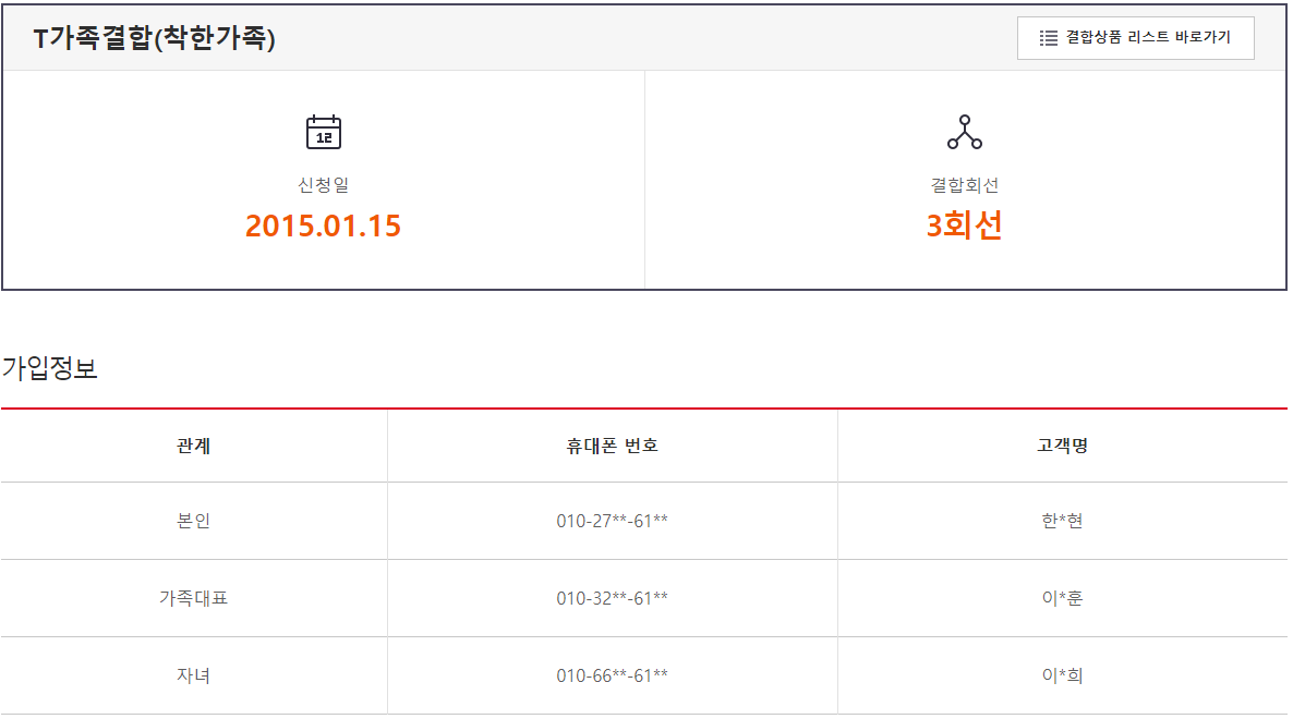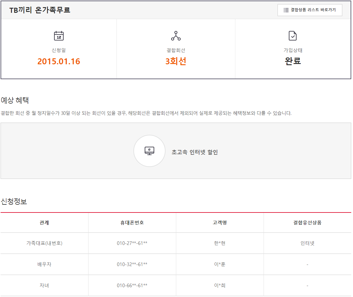 앞서 말씀드린 것처럼 신규가입 인터넷 + TV 결합에는 패밀리 적용이 바로 되지 않으니