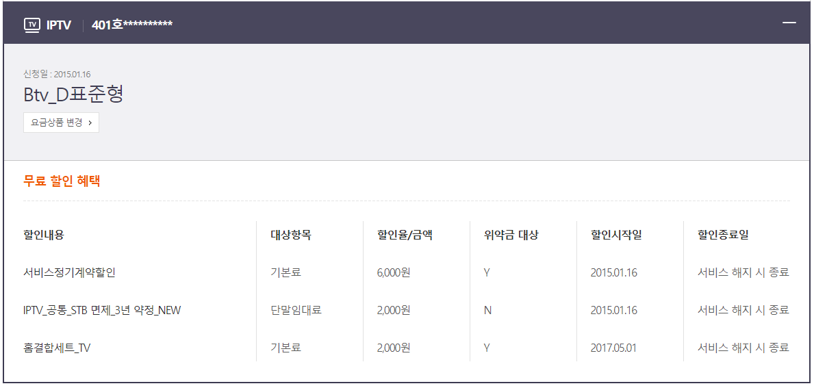 문제는 B tv를 이용한 지는 3년이 넘었는데, 어머니께서 작년 5월에 휴대폰을 새로 구입하시면서 가입 상품도 새로 교체하셨습니다. 그것때문에 홈결합세트_TV의 할인시작일이 갱신되었습니다. 이 부분은 IPTV 약정이 끝난 것으로 봐야 하는지 잘 모르겠네요.