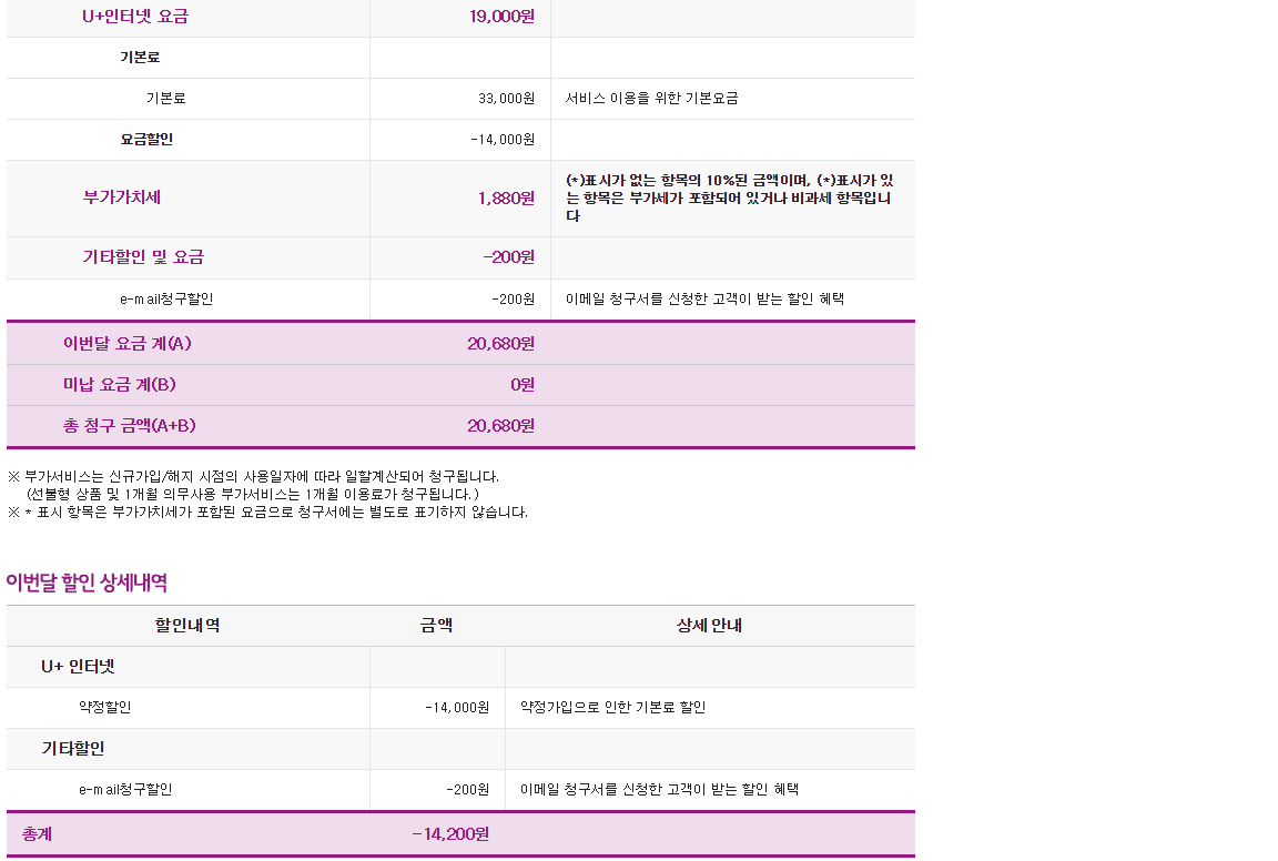 요금제는 인터넷 광랜_주택(19)이며 20.680원 청구되고있고,
