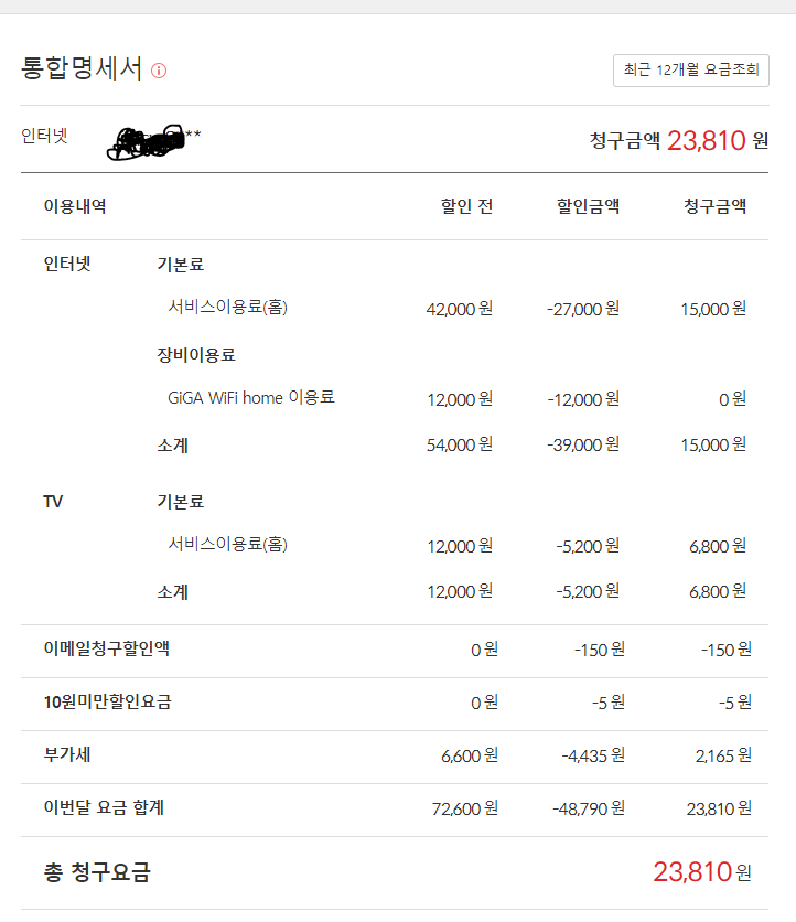 제가 12월 명세서를 캡처해보았는데요, 이정도 가격대로 이용중입니다