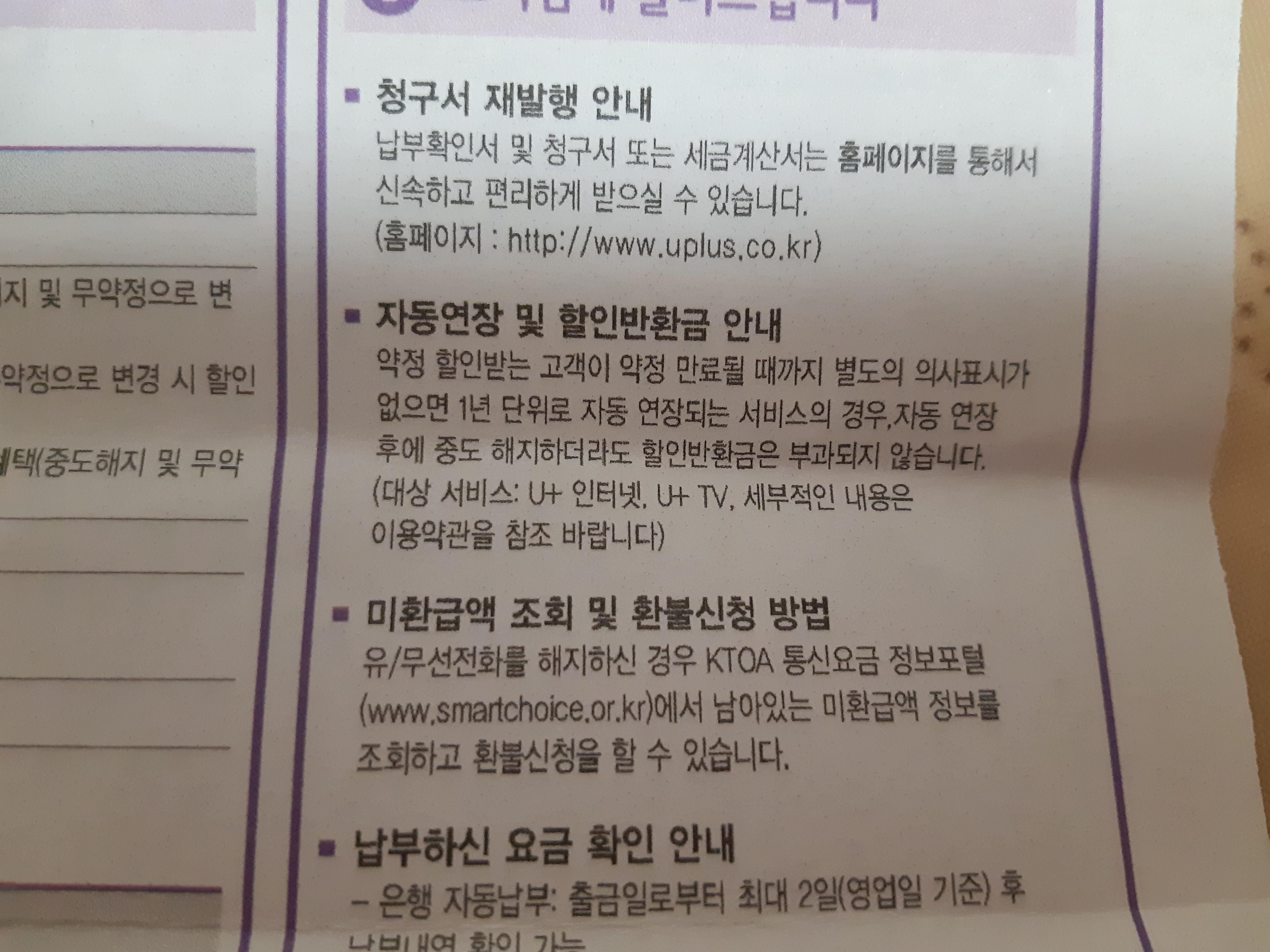 별도의 의사표시가 없으면 U플러스 인터넷, U플러스 tv는 1년 단위로 자동 연장된다고 나와있습니다.