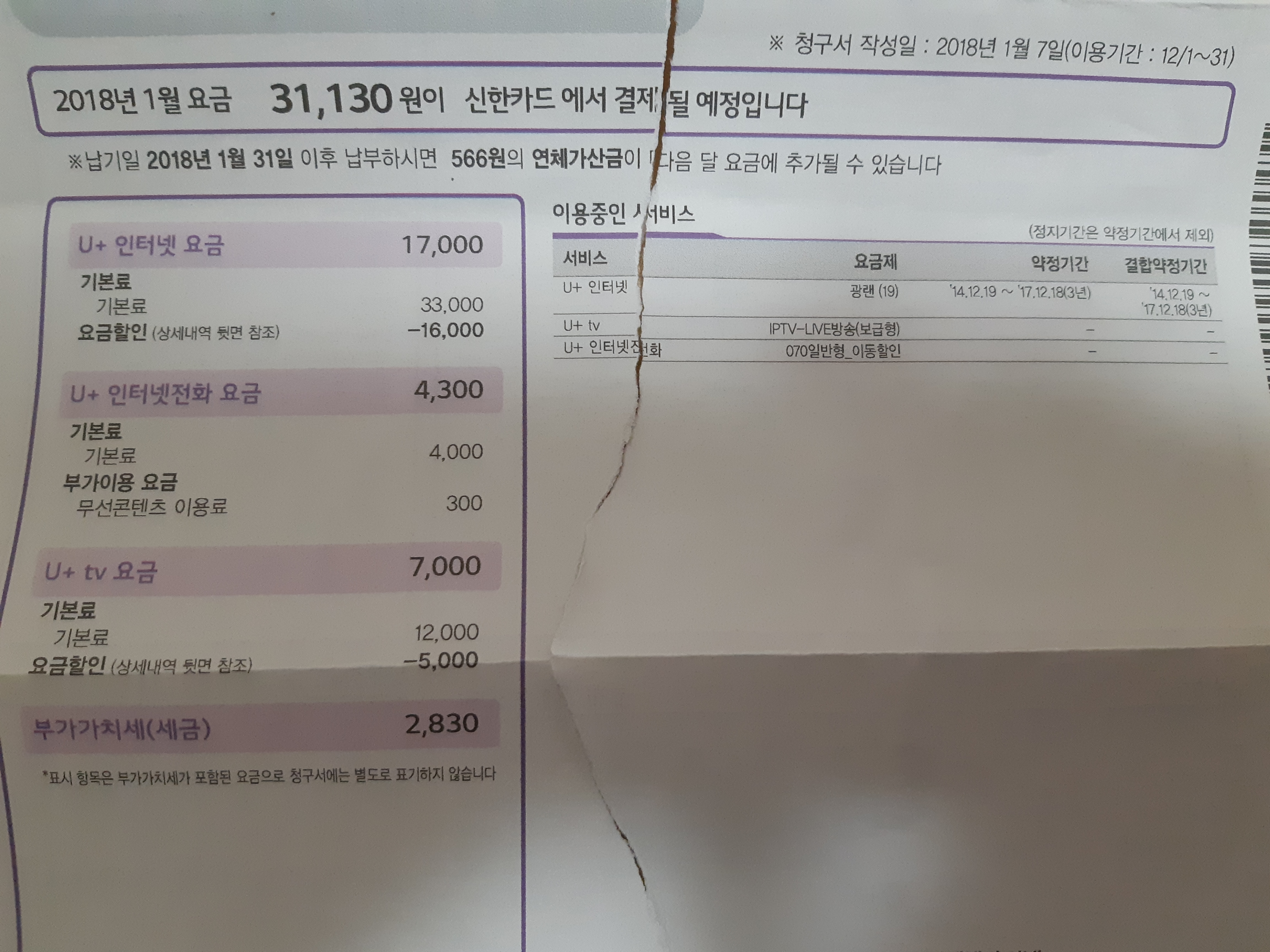 LG 유플러스에서 사용하고 있던 인터넷, tv, 인터넷 전화 결합 약정이 작년(2017.12.18)에 만기됐습니다.
